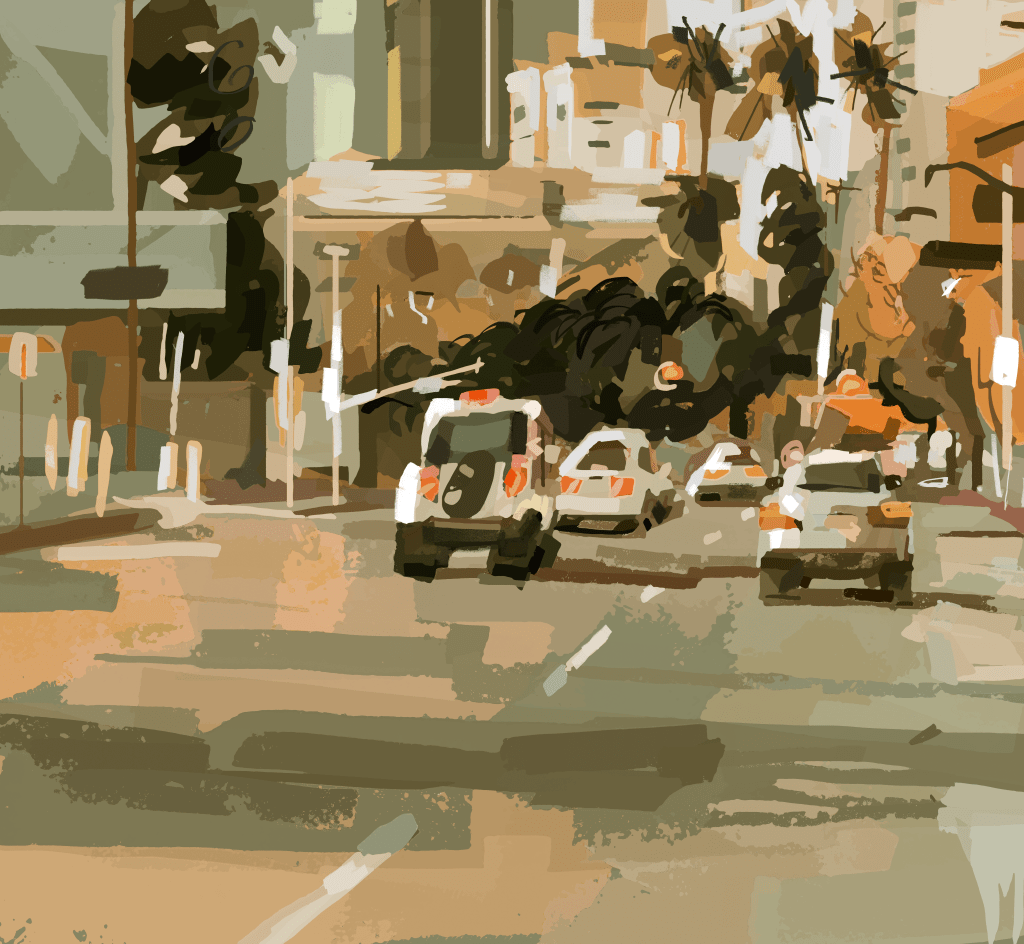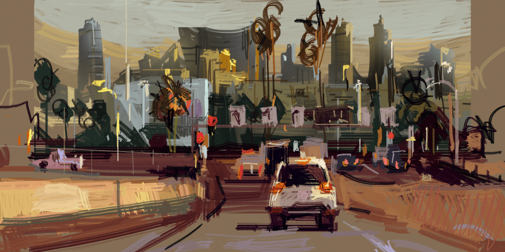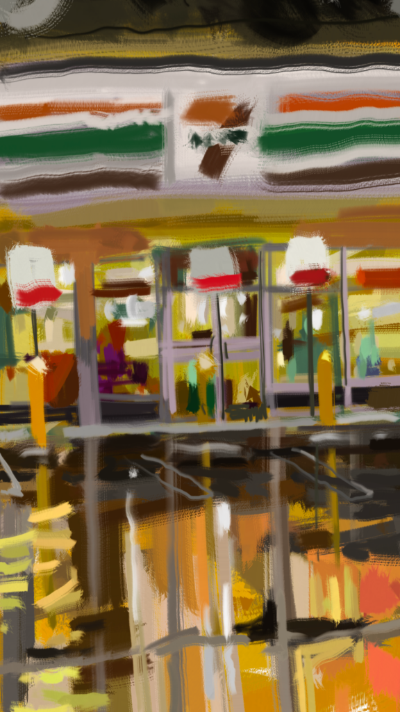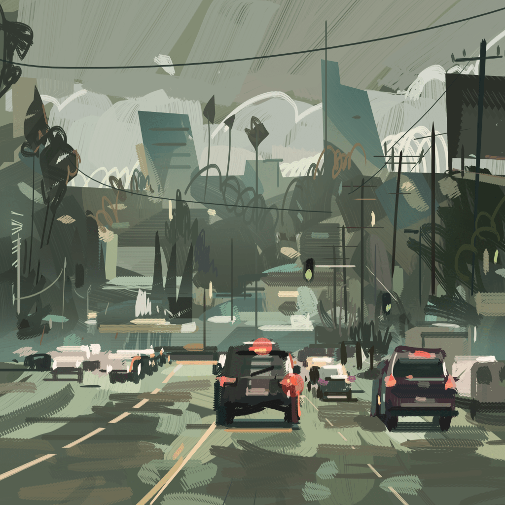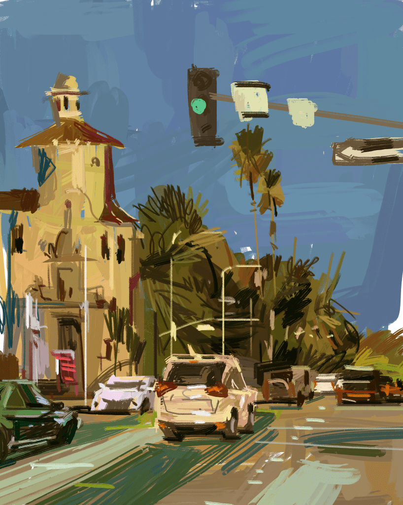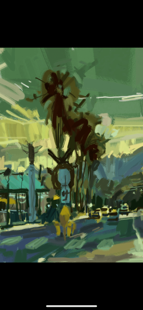 Yesterday took half of my lunch to paint this in Photoshop. Los Angeles is so desaturated when it rains. I was Driving down Sunset and thought this sight was Impressionable, so I went home and painted it from memory. It’s been a while. Something is zen about painting from memory.